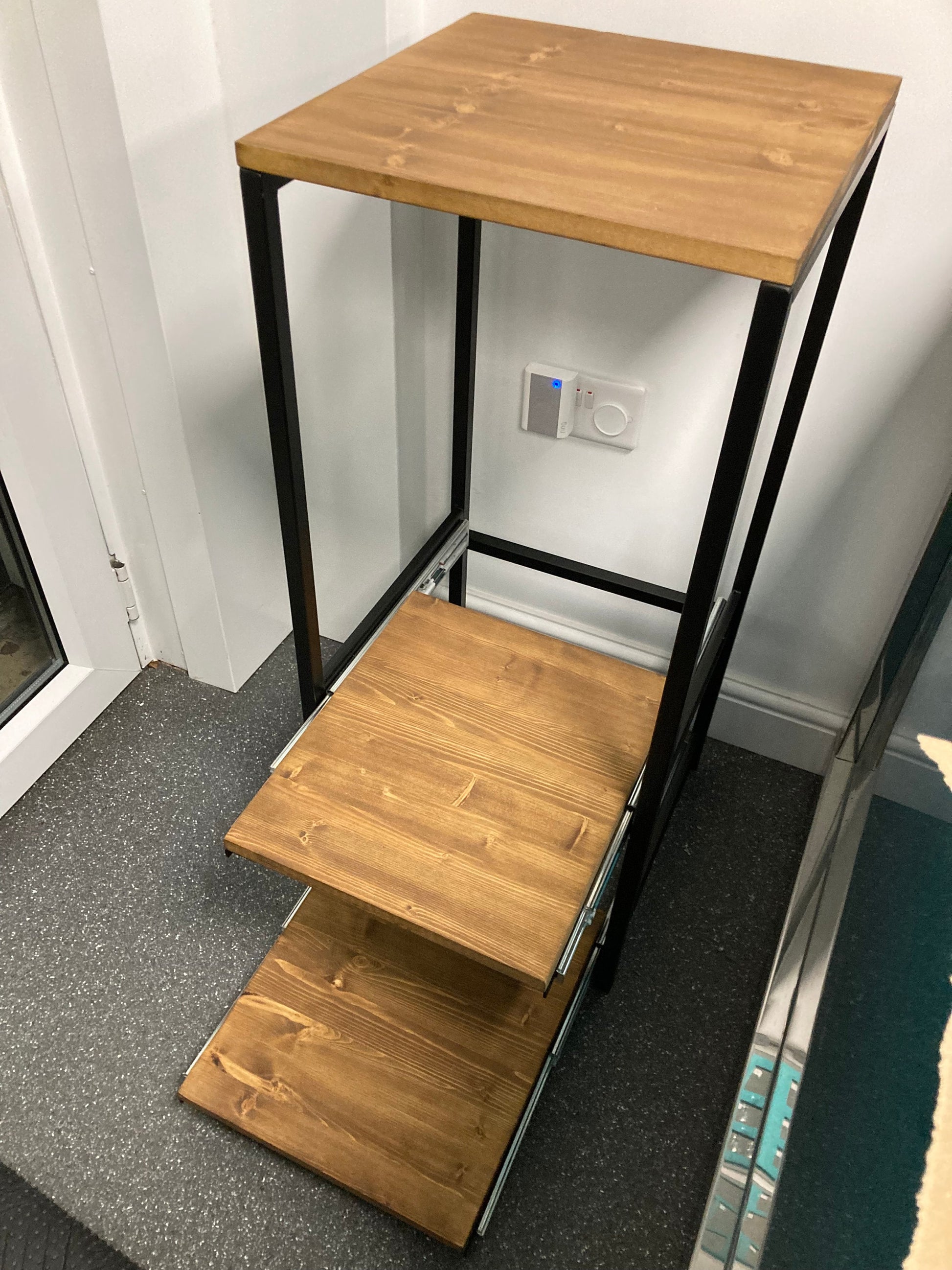 Contemporary black section box frame that is TIG welded as this creates a very nice finish with small neat welds. The unit has two pull out shelves on soft close runners and the top shelf is fixed. The metal is finished in Matt Black.